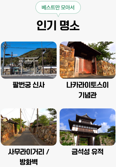 팔번궁신사, 나카라이토스이기념관, 덕혜옹주 결혼기념비, 금석성, 조선통신사접우비 등 관광