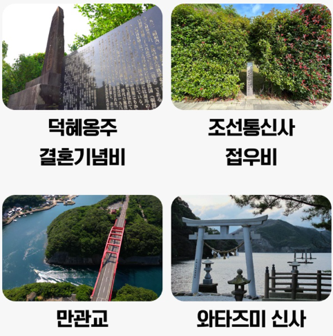 - 팔번궁신사 -> 나카라이토스이기념관 -> 대마도 사무라이 벽거리 -> 금석성 유적 (가네이시성터) -> 덕혜옹주 결혼기념비 -> 조선통신사접우비 관광
