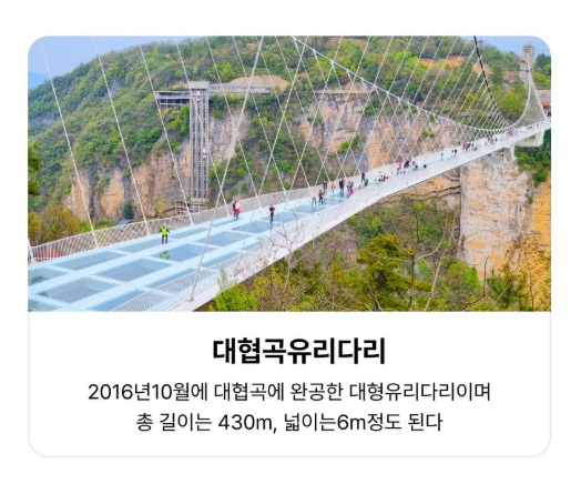 호텔조식 → 천문산(케이블카 왕복+귀곡잔도) → 대협곡 유리다리왕복 → 호텔 투숙 및 휴식