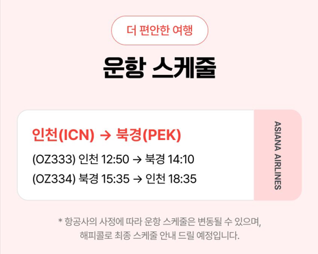 - 북경출발 OZ334 15:35-18:35 인천도착 (비행시간 : 02시간 00분)