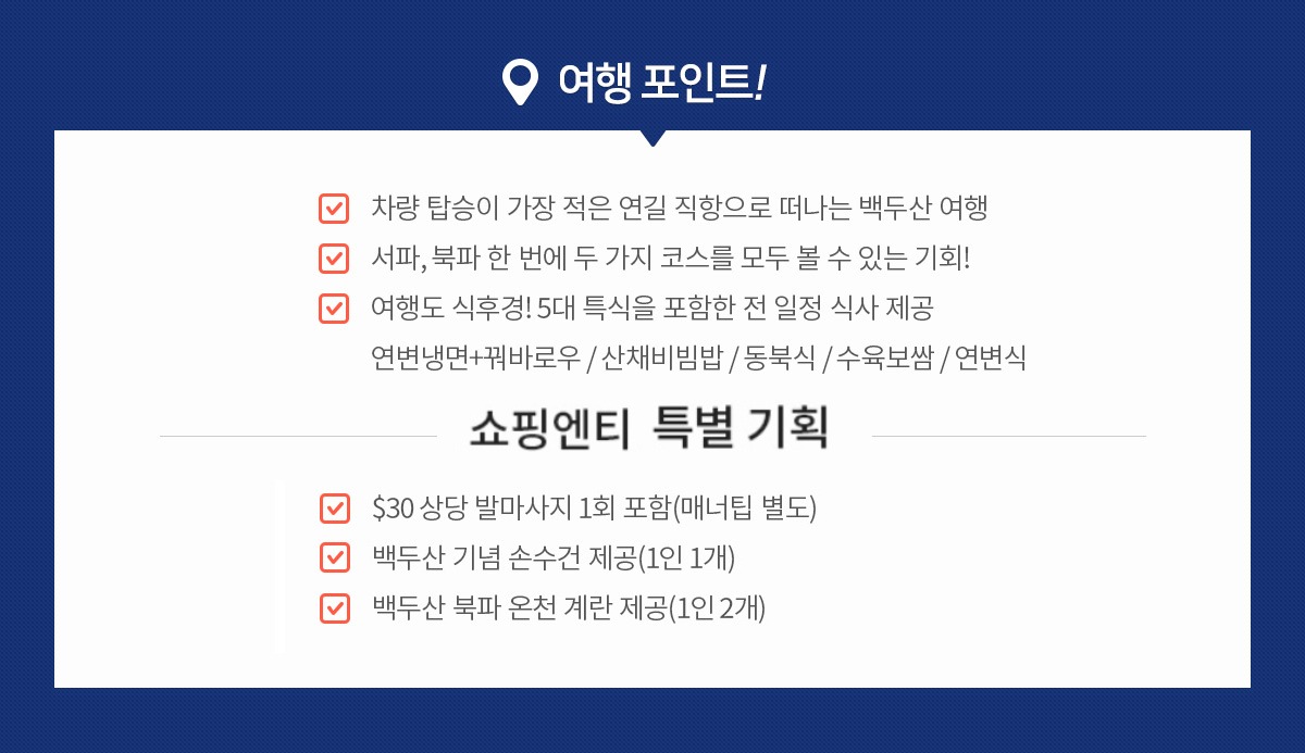 - 여행도 식후경! 5대 특식을 포함한 전 일정 식사 제공 연변냉면+꿔바로우/산채비빔밥/동북식/수육보쌈/연변식