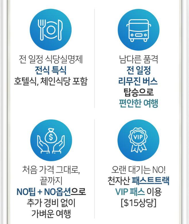 호텔 조식 - 쇼핑센터 2회 방문 - 황룡동굴 - 중식 - 천자산 케이블카(편도) VIP 통로 이용 - 공중전원 - 백룡 엘리베이터(하산) - 석식 - 천고정쇼(VIP석) - 호텔 휴식