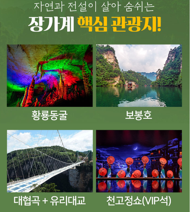 호텔 조식 - 황룡동굴 - 중식 - 천자산 케이블카(편도) VIP 통로 이용 - 공중전원 - 백룡 엘리베이터(하산) - 석식 - 천고정쇼(VIP석) - 호텔 휴식