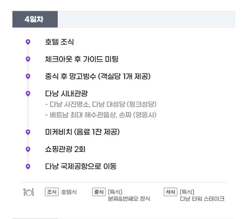 - 4일차: 조식 (호텔식) 체크아웃 후 가이드 미팅 중식 (반쎄오 정식) 망고빙수 (2인당 1개 제공) 다낭 사진 명소 다낭 대성당(핑크성당) 베트남 최대 해수관음상 손짜(영응사) 다낭 대표 해변 미케비치 (음료 1잔) 쇼핑 2회 석식 (다낭 타워 스테이크) 다낭 국제공항으로 이동 식사 조식: 호텔식 중식 : [특식]반쎄오 정식 석식 : [특식]다낭 타워 스테이크