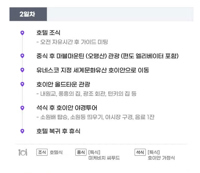- 2일차: 조식 (호텔식) 오전 자유시간 후 가이드 미팅 중식 (목식당 씨푸드) 산 전체가 대리석으로 이루어진 마블마운틴(오행산) 관광 유네스코 지정 세계문화유산 호이안 올드타운 (내원교, 광조회관, 턴키의 집, 풍흥의 집) 석식 (호이안 가정식) 호이안 야경투어 (소원배 탑승, 소원등 띄우기, 야시장 구경) 호텔 복귀 후 휴식 식사 조식 : 호텔식 중식 : [특식]목식당 석식 : [특식]호이안 가정식 숙박 래디슨 RED 다낭 (Radisson RED Danang)