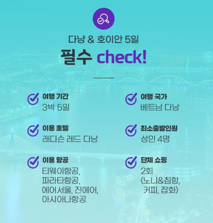 - 출발 : OZ0755 인천국제공항(ICN) 18:45 - 다낭국제공항(DAD) 21:45 (총 05시간 00분 소요)