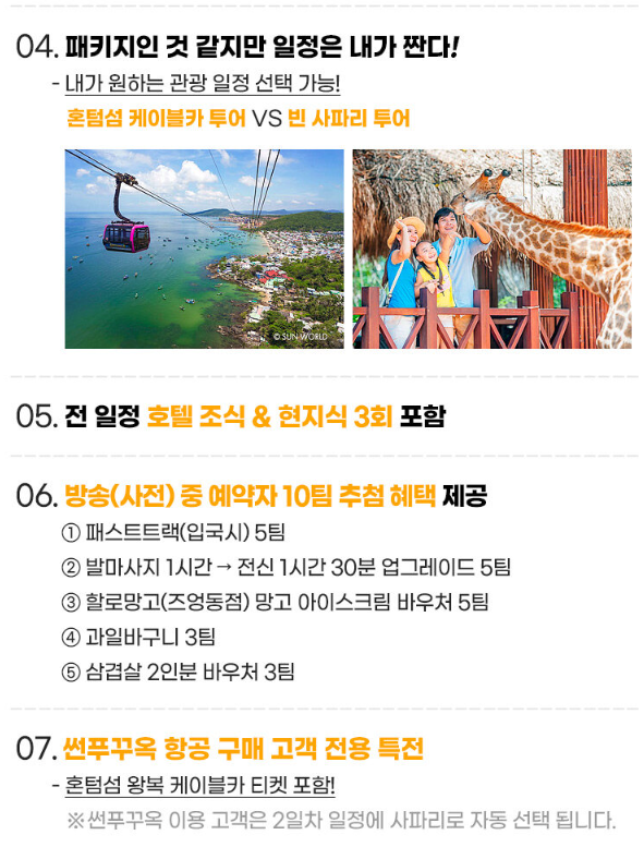 리조트 조식 후 → 차량기사 미팅 → ① 혼똠섬 케이블카 투어 VS ② 빈 사파리 투어 중 택1 / 차량만 포함, 가이드 미동행 → 일정 종료 및 자유 석식 후 리조트 이동 및 휴식