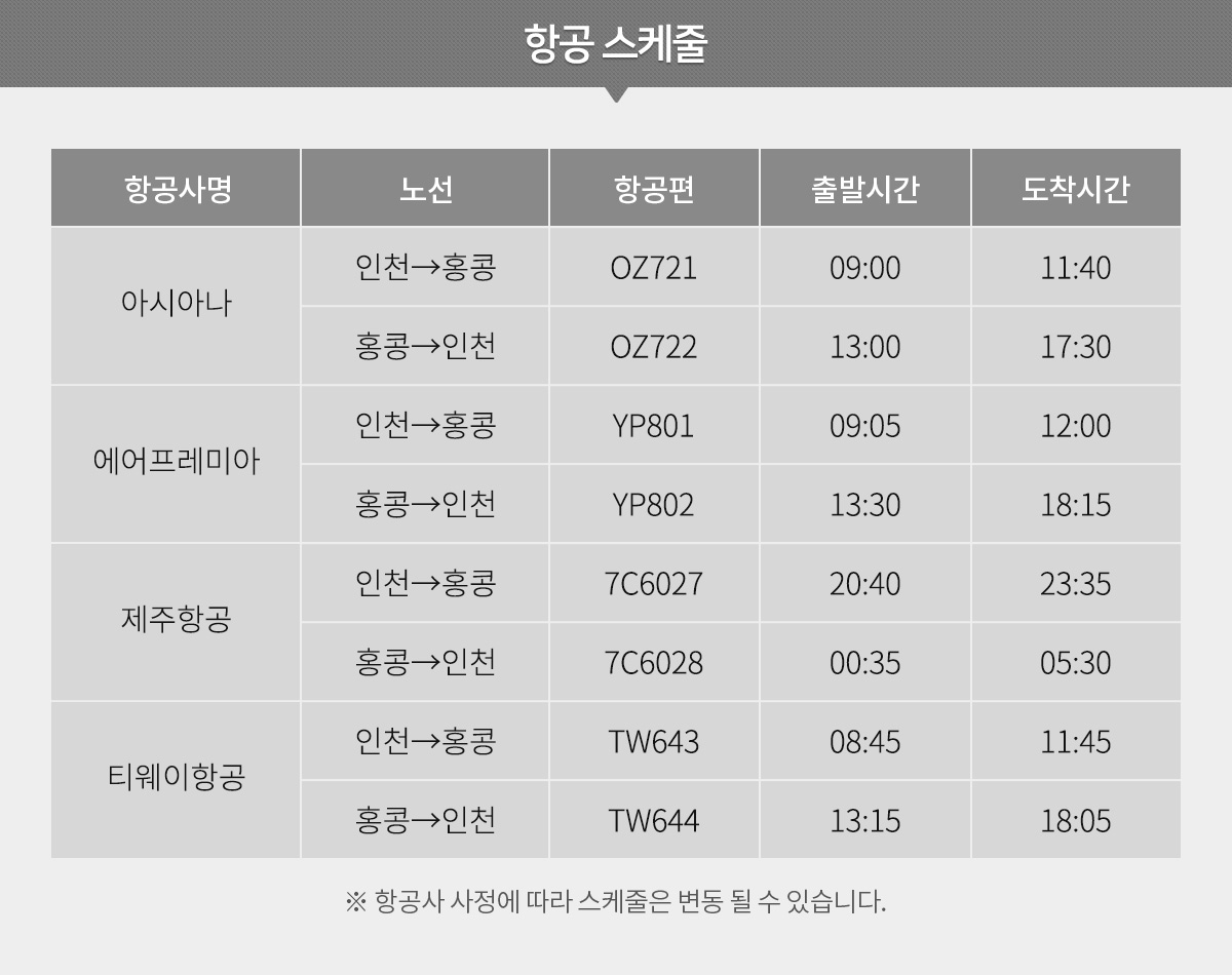 YP801 인천 출발 09:05 - 홍콩 도착 11:55 / YP802 홍콩 출발 13:40 - 인천 도착 18:15