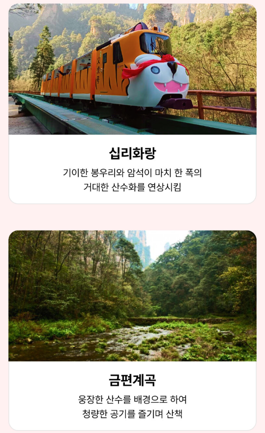 호텔 조식 후 → [관광] 금편계곡, 십리화랑(모노레일 탑승), 보봉호수(VIP코스+유람선 탑승), 천문산(케이블카 탑승), 귀곡잔도, 천문산사 → 호텔 투숙 및 휴식