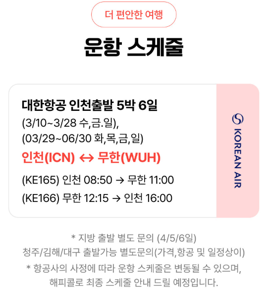 항공사: 대한항공 (한국 인천 국제 공항 ↔ 중국 무한 국제 공항)