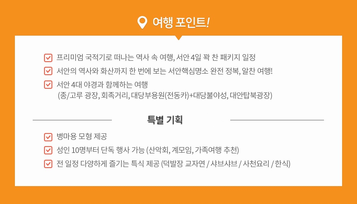 - 성인 10명부터 단독 행사 가능 (산악회, 계모임, 가족여행 추천)