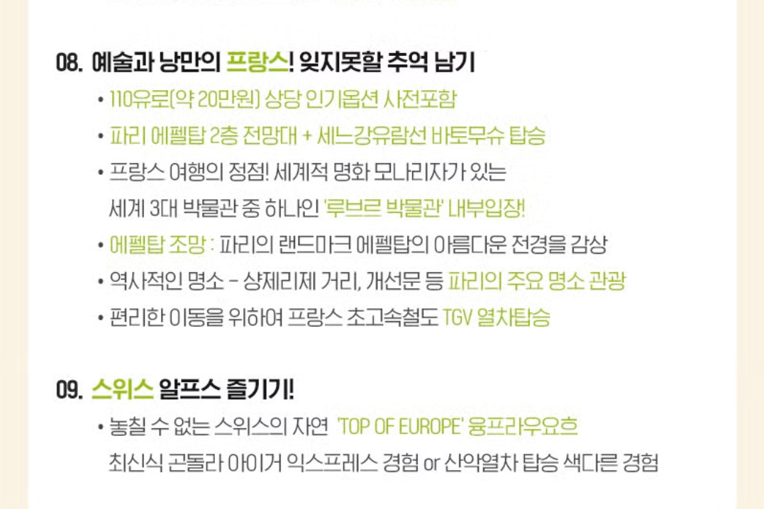 - 유럽의 관문/여왕의 나라 영국, 예술과 낭만의 프랑스, 청정 자연의 알프스 스위스, 유네스코 문화유산의 천국 이탈리아를 한번에 즐기는 정통 서유럽 4개국