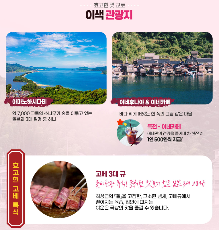 [KE품격][일본 3경, 하늘길과 물의 마을] 효고/아마노하시다테 4일 ▶특식 고베규+천연 온천호텔♨ 최저가 및 기간한정 프로모션 상품만 모았습니다. 하단 달력을 참고하셔서 출발 가능일자를 찾