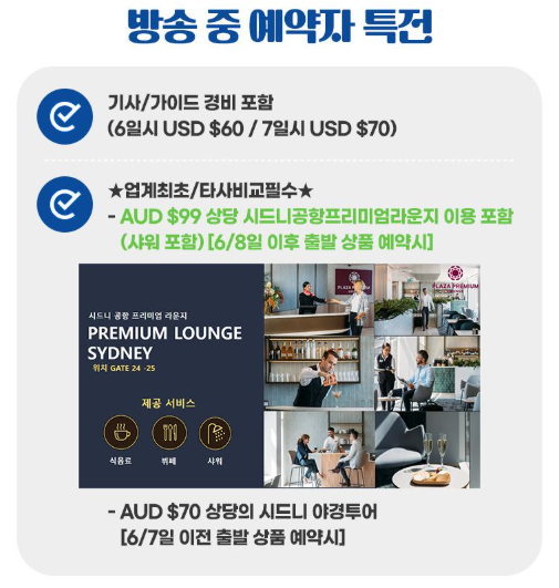 - AUD $99 상당 시드니공항프리미엄라운지 이용 포함 (샤워 포함) [6/8일 이후 출발 상품 예약시]