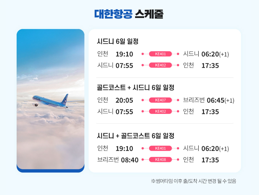 - 출발편 : [KE401] 인천 출발 - 시드니 도착 19:10 ~ 06:20+1 (약 10시간 10분 소요)