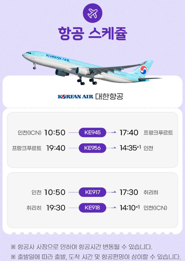 KE946 19:40 프랑크푸르트 국제공항 출발 - 14:35 인천 국제공항 도착 (현지출발 +1일)
