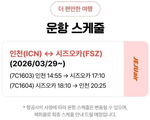 - 출발 : (7C1603) 인천 국제공항 14:55 출발 ? 시즈오카 국제공항 17:10 도착