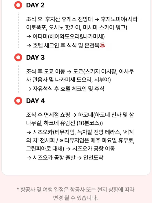 4일차 : 호텔 조식 후 면세점 방문 → 하코네 국립공원 → 하코네 신사 & 삼나무길 → 하코네 유람선 10분 코스 체험 -> 시즈오카 티뮤지엄 → 차밭 전망 테라스 → 시즈오카 국제공항 이동 → 인천국제공항 도착