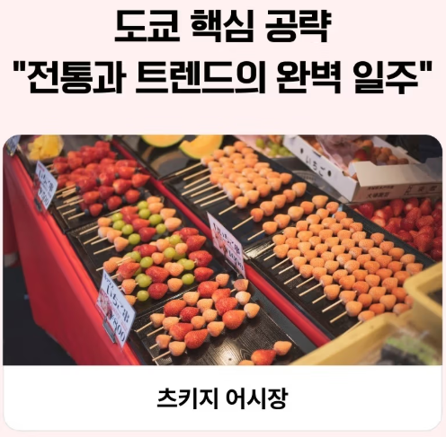 3일차 : 호텔 조식 후 전용차량으로 도쿄 이동 (약 3시간) -> 츠키지 어시장 자유 관광 → 아사쿠사 관음사 & 나카미세 도오리 → 시부야 스크램블 교차로 -> 호텔 체크인 후 휴식