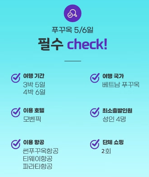 인천출발 (운항시간은 항공연결편 및 항공사의 사정으로 시간변경 및 운항변경 될 수 있습니다.) ■ 오후출발 3박 5일 썬푸꾸옥항공(9G) - 출발 : 9G0451 인천국제공항(ICN) 12:35 - 푸꾸옥국제공항(PQC) 16:25 (총 05시간 50분 소요) - 도착 : 9G0450 푸꾸옥국제공항(PQC) 02:25 - 인천국제공항(ICN) 09:55 (총 05시간 30분 소요) 티웨이항공(TW) - 출발 : TW0055 인천국제공항(ICN) 19:50 - 푸꾸옥국제공항(PQC) 23:35 (총 05시간 45분 소요) - 도착 : TW0056 푸꾸옥국제공항(PQC) 00:35 - 인천국제공항(ICN) 08:05 (총 05시간 30분 소요) 파라타항공(WE) - 수,목 출발 - 출발 : WE0207 인천국제공항(ICN) 21:15 - 푸꾸옥국제공항(PQC) 01:10 (총 05시간 55분 소요) - 도착 : WE0208 푸꾸옥국제공항(PQC) 02:40 - 인천국제공항(ICN) 09:50 (총 05시간 10분 소요) ■ 오후출발 4박 6일 파라타항공(WE) - 토,일 출발 - 출발 : WE0207 인천국제공항(ICN) 21:15 - 푸꾸옥국제공항(PQC) 01:10 (총 05시간 55분 소요) - 도착 : WE0208 푸꾸옥국제공항(PQC) 02:40 - 인천국제공항(ICN) 09:50 (총 05시간 10분 소요) 부산 출발(출발일별 항공,가격,일정 상이)