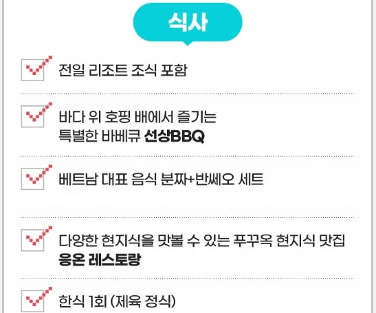1일 일정 인천 국제공항 출발 - 푸꾸옥 국제공항 도착 가이드 미팅 후 호텔로 이동 호텔 체크인 및 휴식 식사 석식 : 기내식-불포함(TW,WE)(썬푸꾸옥항공 기내식 포함)