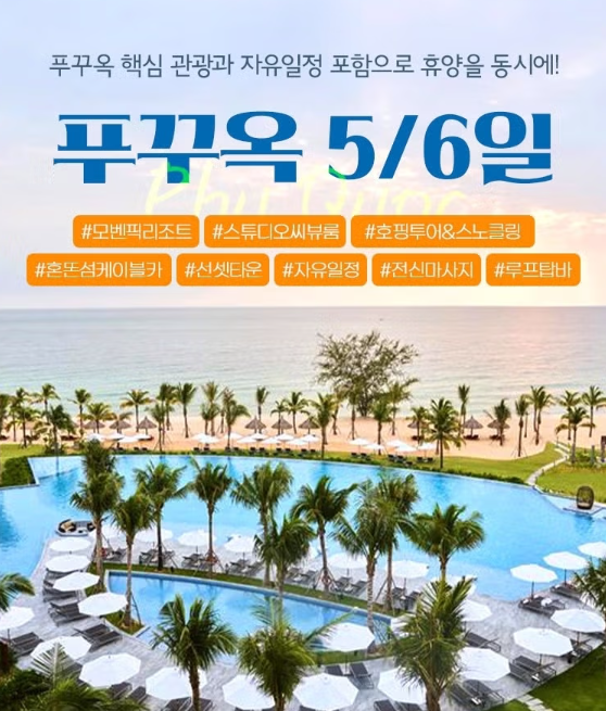 휴양!관광!힐링! 푸꾸옥 5일(5성급 씨뷰룸up+혼똔섬+호핑투어)