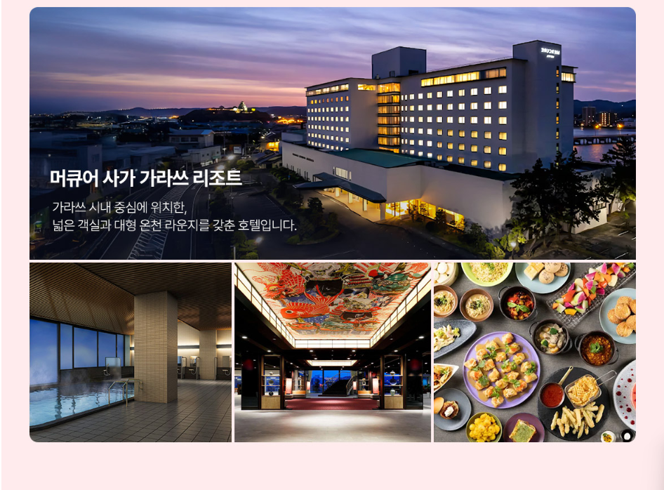 - 머큐어 사가 가라쓰 리조트 또는 동급 : 넉넉한 객실과 대형 온천 라운지에서 여유와 가라쓰 시내 중심에서 편리함을 누리는 머큐어 사가 가라쓰 리조트