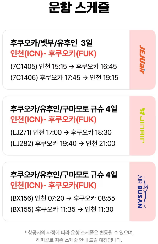 - 도착 : (LJ282) 후쿠오카국제공항 19:40 출발 - 인천국제공항 21:00 도착