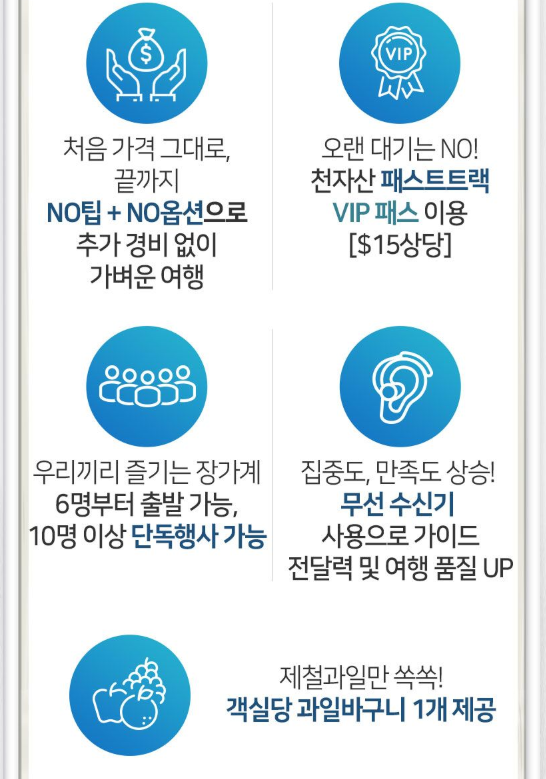호텔 조식 - 황룡동굴(홈쇼핑 특전) - 중식 - 천자산 케이블카(편도) VIP 통로 이용(홈쇼핑 특전) - 공중전원(홈쇼핑 특전) - 백룡 엘리베이터(하산) - 석식 - 천고정쇼(VIP석, 홈쇼핑 특전) - 호텔 휴식