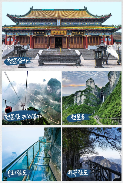 호텔 조식 - 군성사석화 - 중식 - 천문산 케이블카 ? 천문동 - 귀곡잔도+유리잔도(홈쇼핑 특전) - 천문산사 - 동선코스(홈쇼핑 특전) - 석식 - 72기루 차창관광 - 호텔 휴식