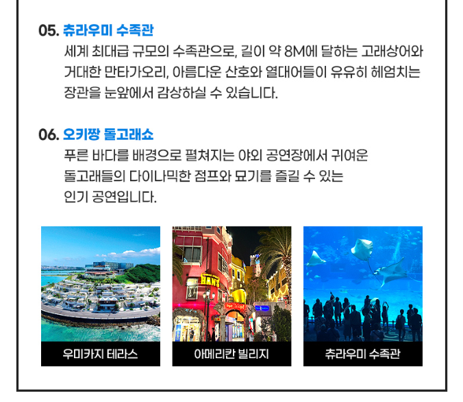 ■ 2일차 : 호텔 조식 후 -> 글라스보트 체험 -> 오키나와 해양박공원 관광 -> 츄라우미 수족관 -> 돌고래쇼 관람 -> 선셋 디너 크루즈 -> 호텔 투숙 및 휴식