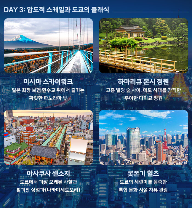 ■ 3일차 호텔 조식 후 → 미시마 이동 → [관광] 미시마 스카이워크 및 스카이 가든 → 주오 이동 → [관광] 하마리큐 온시 정원 → 아사쿠사 이동 → [관광] 아사쿠사 센소지 및 나카미세도오리 → 미나토 이동 → 롯폰기 힐즈 자유 관광 → 호텔 체크인 후 휴식(온천욕) [식사] 조식: 호텔식 / 중식: 현지식(카마메시정식) / 석식: 자유식(1인 2천엔 지급/성인, 아동에 한함) [숙소] 라비스타 도쿄 베이 호텔 또는 동급