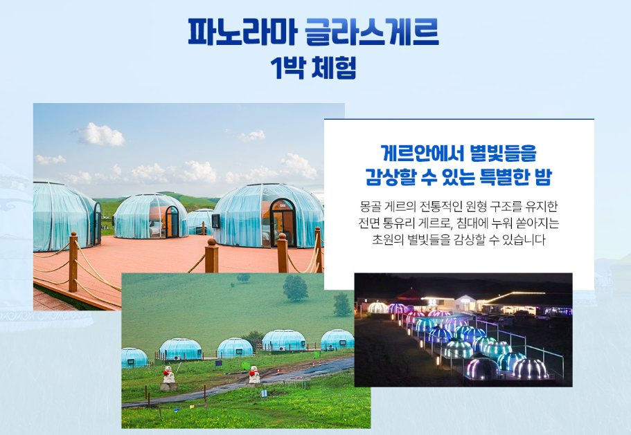 [일정표상의 숙박]2인1실 기준 (3인 예약시 간이침대 제공 ※단, 호화게르 및 글라스게르 숙박시 간이침대 불가)