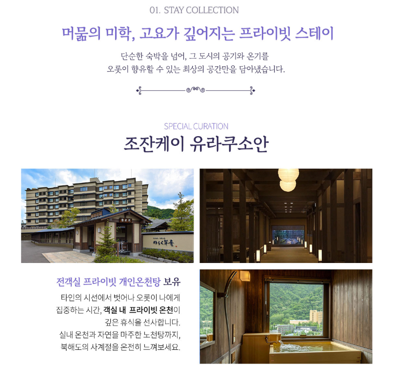 - 조잔케이 유라쿠소안 또는 동급 : 계절별로 바뀌는 경치를 감상하며 온천욕을 즐길 수 있는 호텔