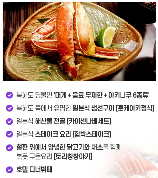 ▶조식 : 호텔식 / 중식 : 현지식(토리창창야키) / 석식 : 특식(대게+음료무제한+야키니쿠6종)
