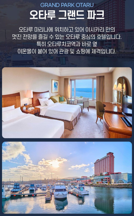 ▶호텔 : 오타루 그랜드파크 (전객실 바다전망) 호텔 또는 동급 (2인 1실 기준)