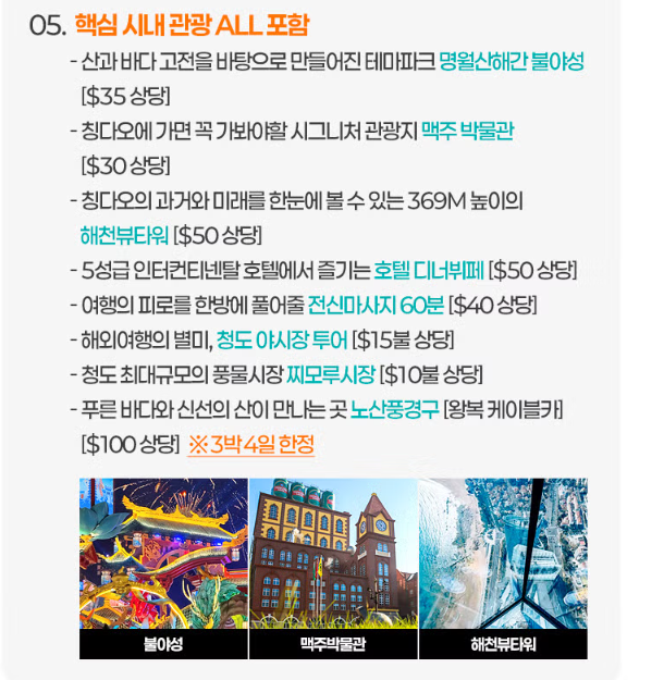 4일차* 조식 후 → 대복도 → 천주교당 → 은허항 → 공항으로 이동 → 청도국제공항 출발 → 인천국제공항 도착 식사 : [조식]호텔식 [중식]현지식 총 1~2회 (라텍스,차, 침향 中)