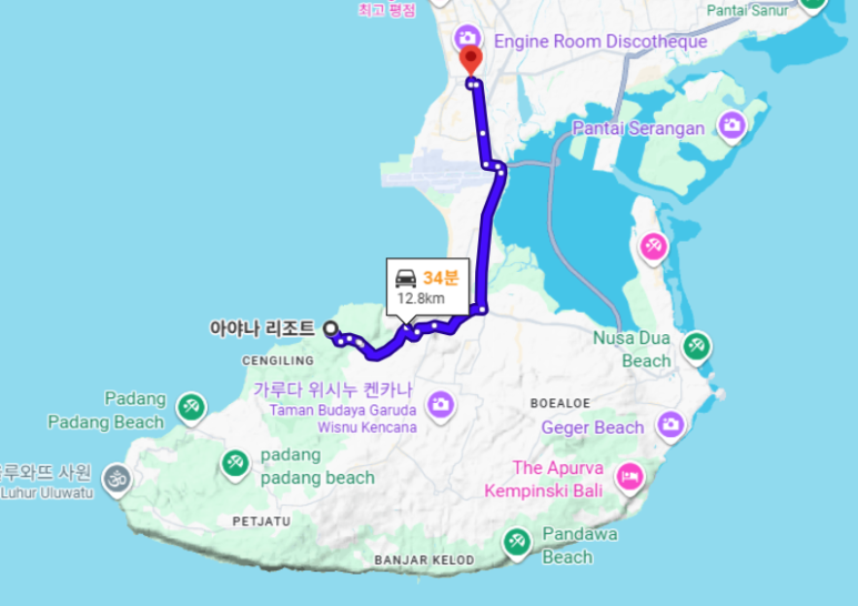 아야나 발리는 발리 남서쪽 짐바란 절벽 위에 자리한 럭셔리 리조트로, 인도양과 아름다운 선셋을 한눈에 감상할 수 있어요. 넓은 리조트 단지 덕분에 여유롭게 산책하며 휴식하기 좋고, 발리 허니문 숙소로도 많은 사랑을 받고 있습니다. 아래 지도를 참고해 보세요 ^^