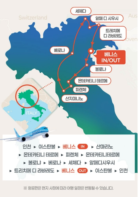 ☞베니스 1박, 몬테카티니 테르메 2연박, 베로나1박, 볼차노1박, 코르티나 담페초 1박 ★전일정 일급호텔 - 6박