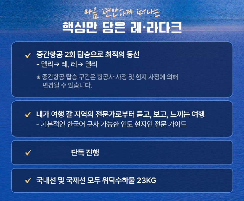 - 인천 ↔ 델리 왕복 + 레 국내선 이동