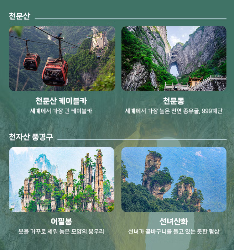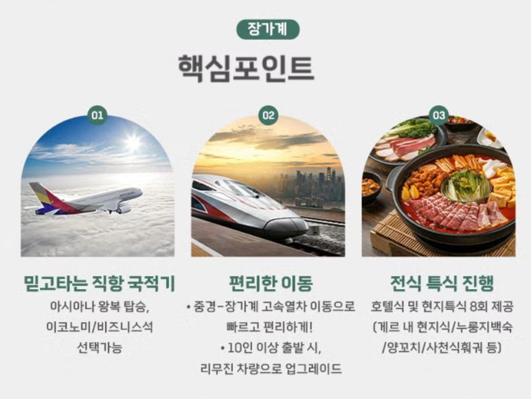 - 편리한 이동 중경-장가계 고속열차 이동으로 빠르고 편리하게! 10인 이상 출발 시, 리무진 차량으로 업그레이드